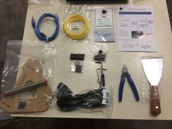 コード類、ボール付き六角レンチ、マイナスドライバー(小)、SDカード、SDリーダーUSBアダプター、フィラメントカッター、おまけのフィラメント、USBコード、組立図(中国語、英語)、ネジ、合格証、サポートカード、フィラメントスタンド