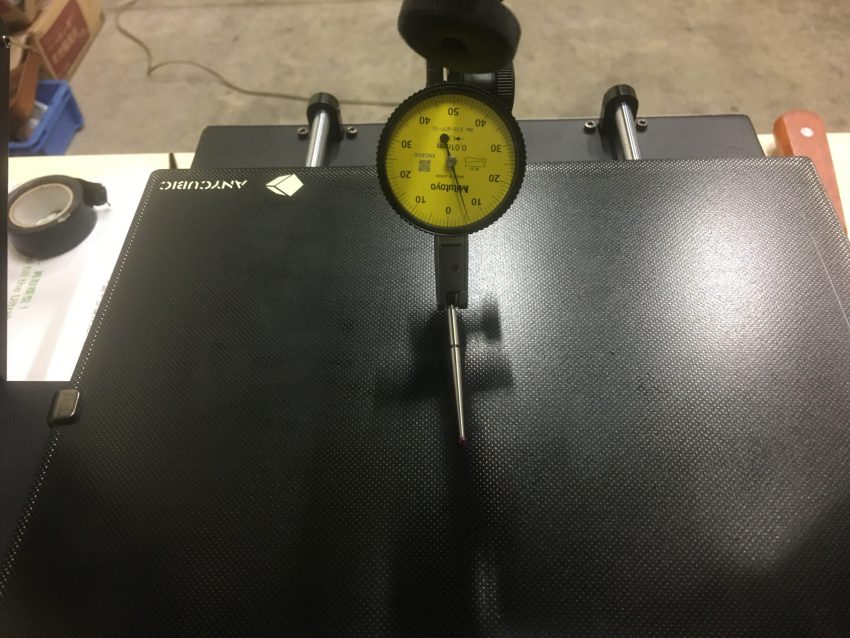 XーY軸を移動させダイヤルゲージを読み取る。平面度、想像より良かった。冷却時で0.05
