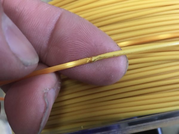↓ リール交換で最後はノズル先端からエクストルーダーまでの距離分が使えない。ノズルのすぐ上にエクストルーダーがあるタイプならその距離も短いが、ノズル部軽量化の為、私の使っている機種はエクストルーダーが離れているので、30-40センチが無駄になるので次に使うフィラメントを半田ごてで接合。うまく接合できれば無駄なく使える。押し出すだけなので、極端に曲げなければ大丈夫。